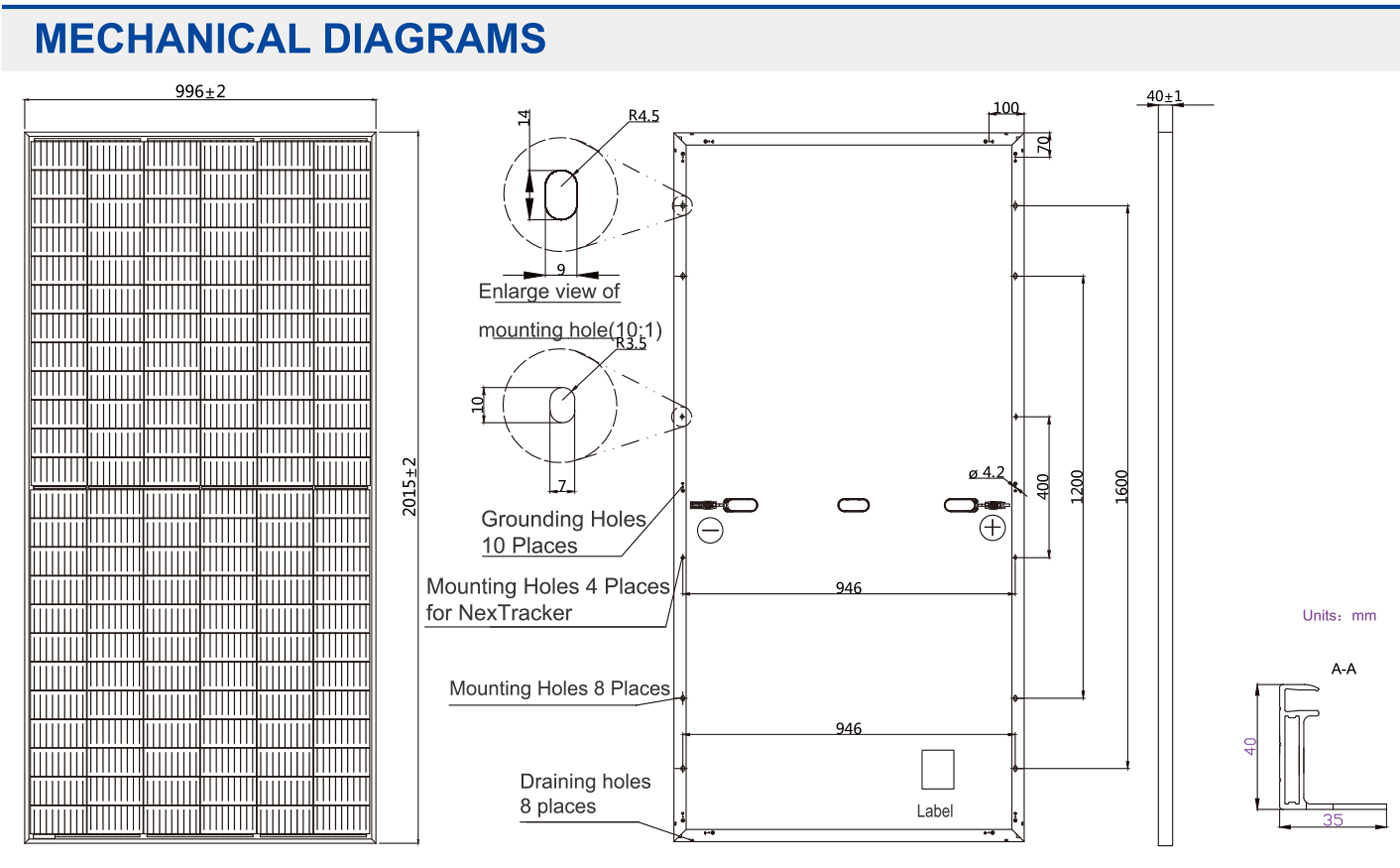 Remark: Electrical data in this catalog do not refer to a single module and they are not part of the offer.They only serve for comparison among different module types. *For NexTracker installations static loading performance: front load measures 2400Pa, while back load measures 2400Pa.